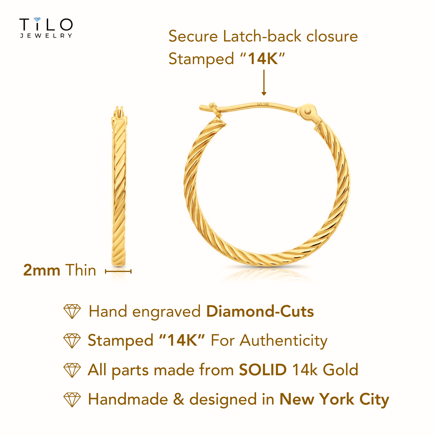 14K Yellow Gold Hoop Earrings with Hand Engraved Tornado Design, 2mm Thin, All Sizes