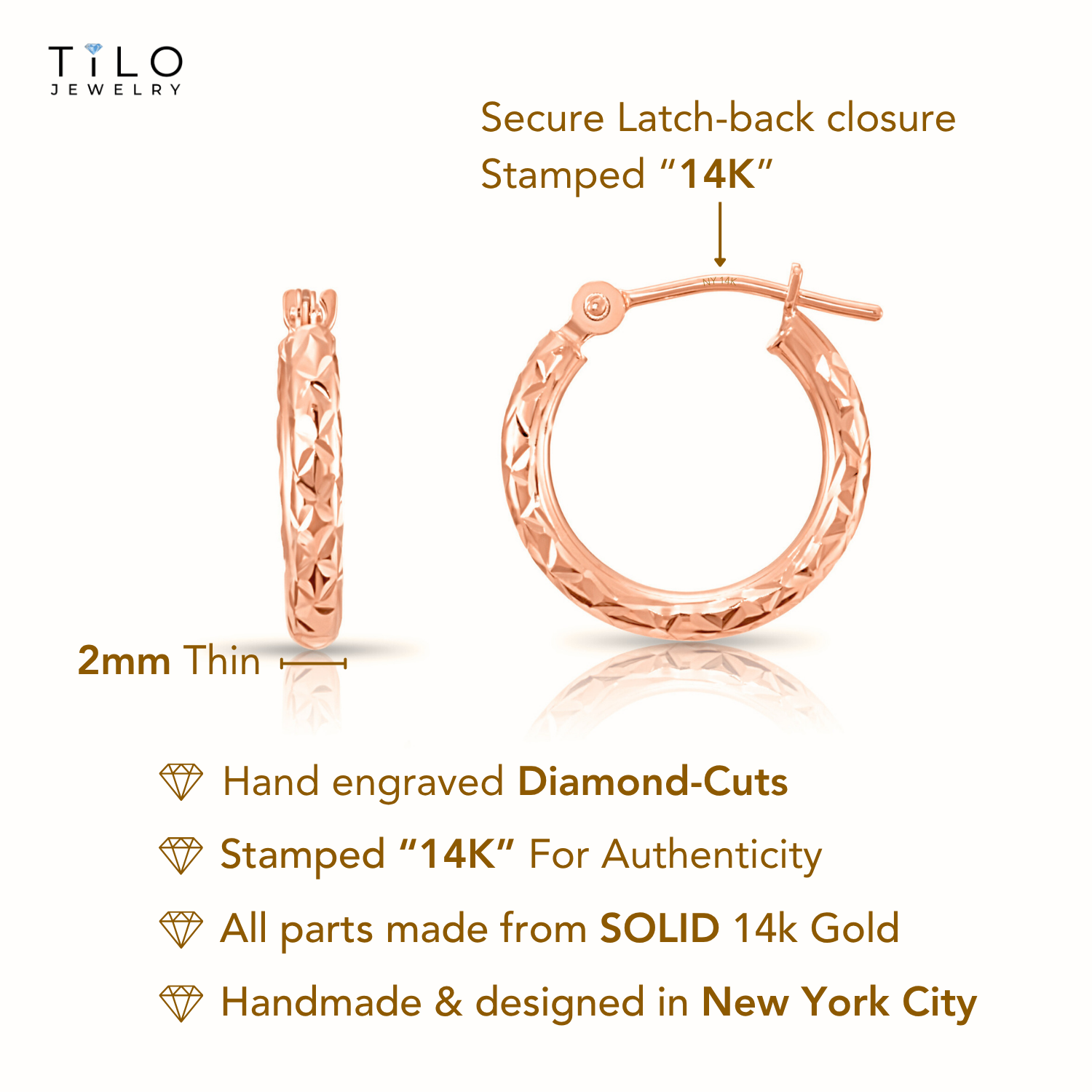 14K Rose Gold Hoop Earrings, Hand Engraved X-Pattern